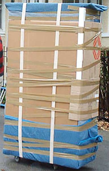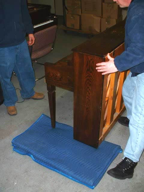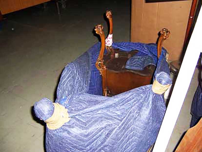 Below is shown a well-padded antique desk with damaged and broken legs sitting upside down. The pads are protecting its top while it sits in this position and the damaged area is left exposed. This piece should be dollied or carried upside down like this so that anyone handling it can see the problem and avoid making it worse.