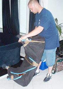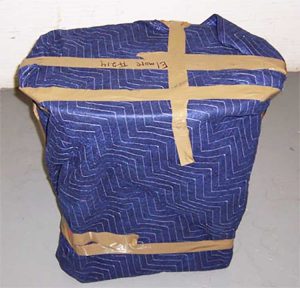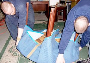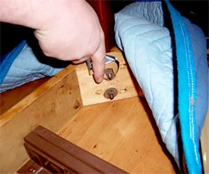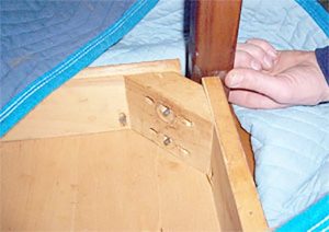 Any table that won’t fit through a doorway, however, must have its legs removed before it is wrapped for moving. Be careful when using a drill to unscrew the legs so as not to wind the screws the wrong way and push them up through the table’s top! Also, take care not to lose the removed hardware parts because they may be difficult to replace.